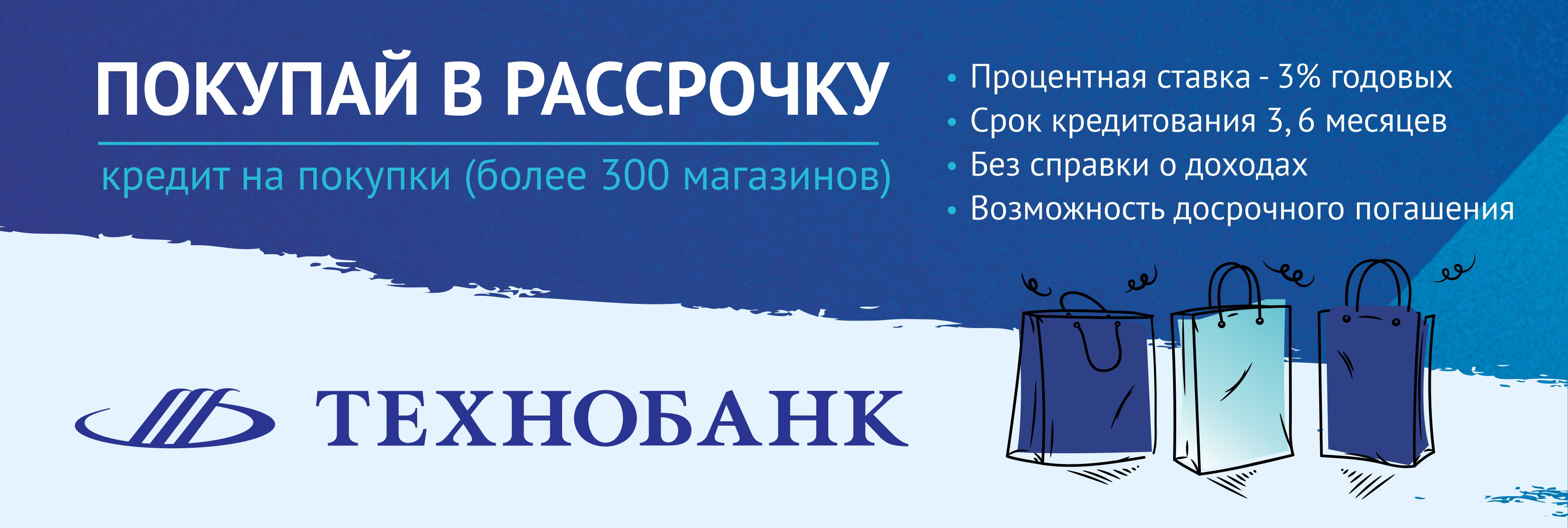 Став партнером ещё одного белорусского банка, у нас появилась возможность предоставления нашим покупателям кредитного продукта "Рассрочка от "Технобанк" сроком на 3 и 6 месяцев на сумму от 500 до 5.000 рублей и под 3% годовых. Данный вид рассрочки также оформляется без первоначального взноса, без поручителей. Справка о доходах не требуется.